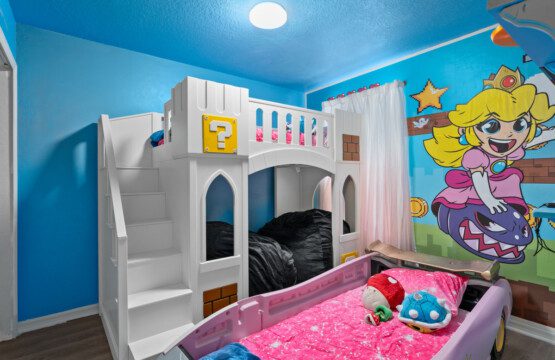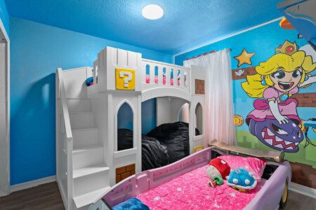 Welcome to Mario Kart Mayhem! The Nintendo-inspired listing that all ages can get excited about! The boys’ room immerses kids in the “Mario Kart” games while the girls’ room is based on Princess Peach and her castle. The best part is, that both kids’ rooms come with their own Nintendo Switch!