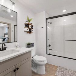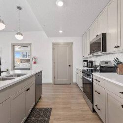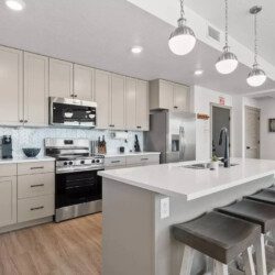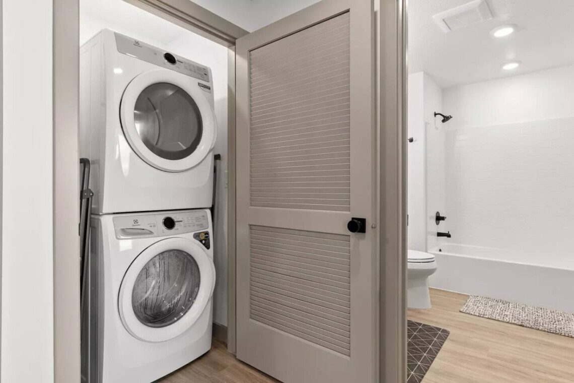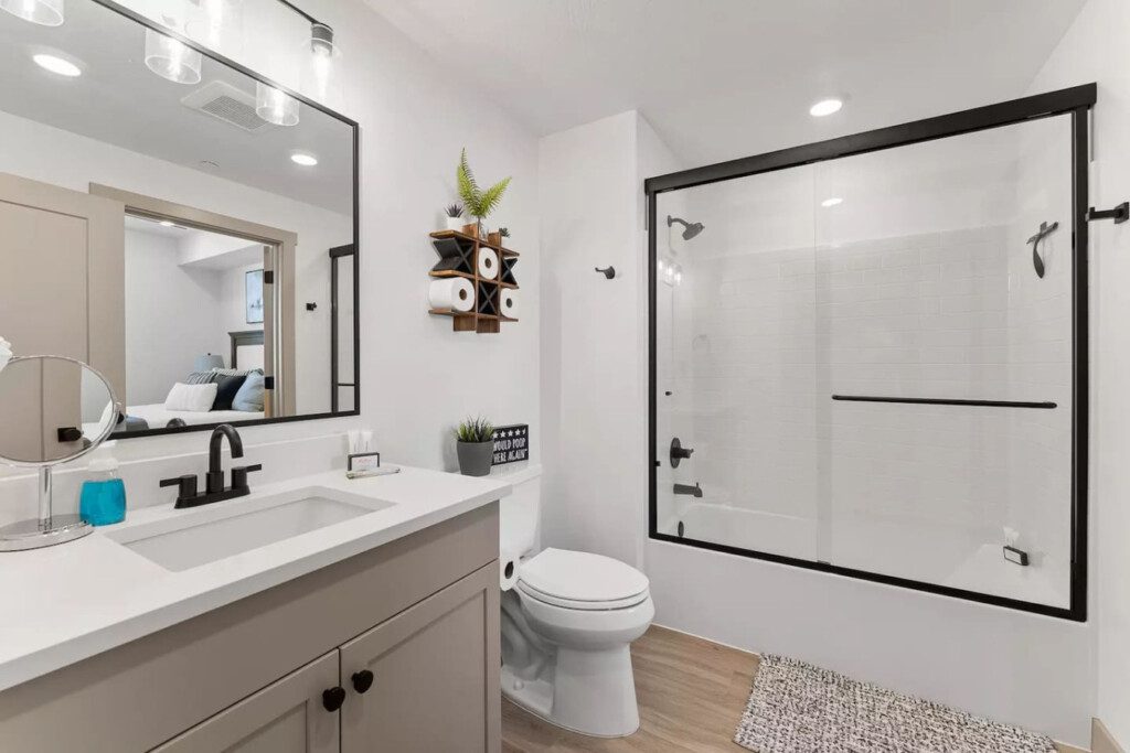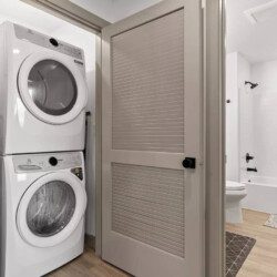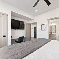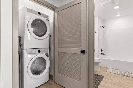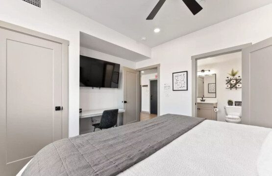 Our generously sized unit features a contemporary, open-concept floor plan. Please Note: This unit is located on the second floor and is accessible via stairs only (no elevator). Highlights include: Premium Sleeping for 6: Bedroom 1 features a plush King Bed with a private ensuite bathroom. Bedroom 2 also features a plush King Bed and an ensuite bathroom that is also shared with the main unit. The living area includes a comfortable couch with a Queen Hideaway Bed (sleeper sofa). The unit offers a Fully Equipped Kitchen with modern cabinets, stainless steel appliances, and all the necessary cookware for easy meal preparation. Enjoy group meals in the dedicated dining space. Modern comforts include high-speed Wi-Fi, central air, and in-unit laundry (washer and dryer). Relax with entertainment on the Smart TVs, which are provided with the Hulu, ESPN, and Disney Plus streaming bundle for your use.